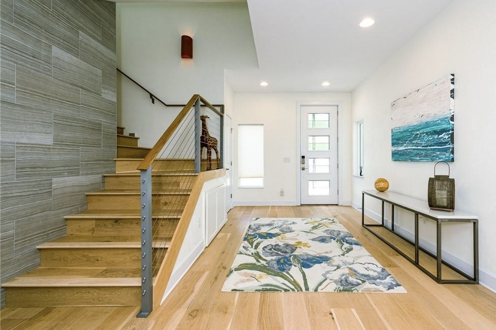 Inside, the vibe is clean, modern, and effortlessly cool. Tile anchors the main level, while rich pecan hardwood warms the foyer, staircase, and upstairs living. Every wall and ceiling is smooth plaster—because details matter.