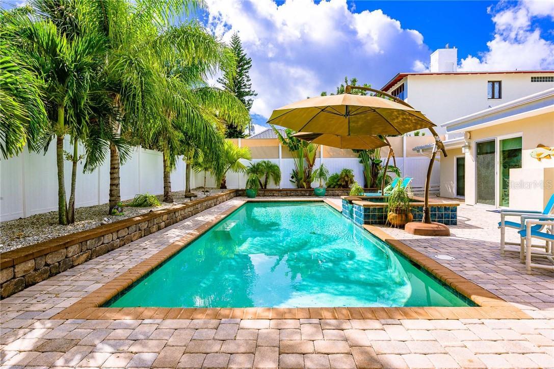 A 40’ x 13’ resort-style pool, elevated spa, water features, tiki hut shade, and palms swaying overhead set the scene. Fully fenced side and backyard, accented with local coquina stone, keep things private and peaceful. Xeriscaped grounds mean low maintenance and no irrigation bills—Mother Nature handles it.